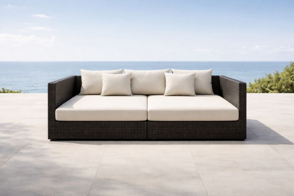 Canapé d'extérieur en résine tressée brun coussins crème
