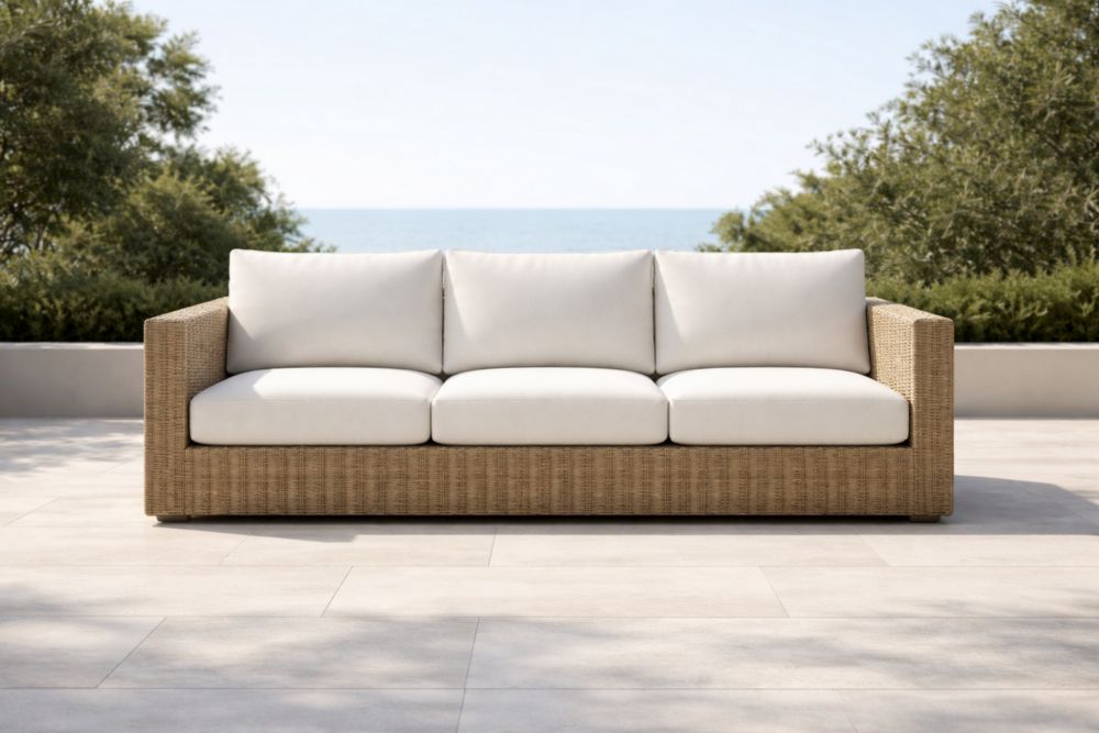 Canapé d'extérieur en résine tressée marron avec coussins blancs