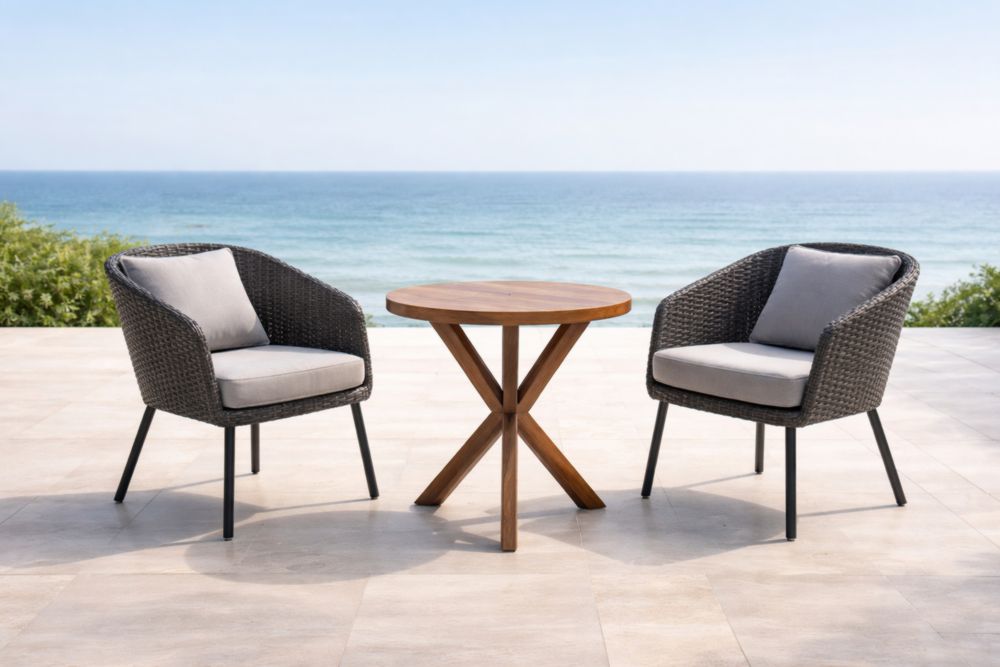 Liste des produits : 2 chaises, 1 table ronde.Coussins inclus