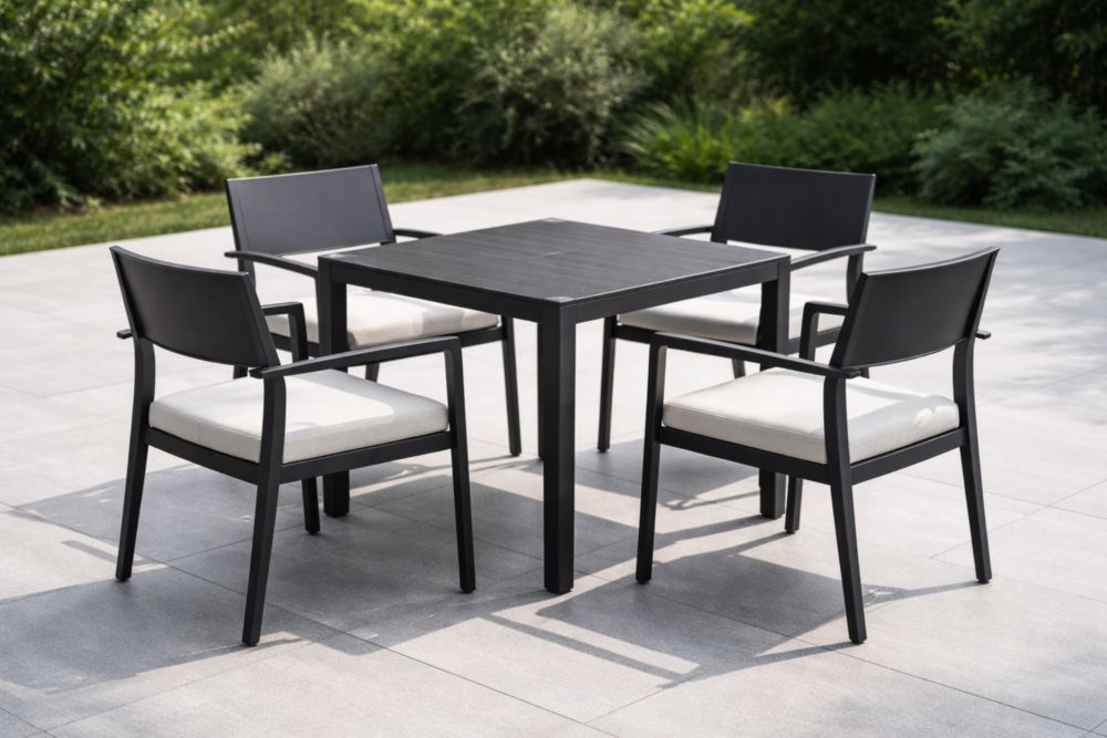 Ensemble de salle à manger extérieur en métal noir avec coussins en tissu