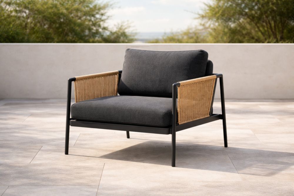 Fauteuil d'extérieur en tissu gris avec accoudoirs en rotin et cadre en métal