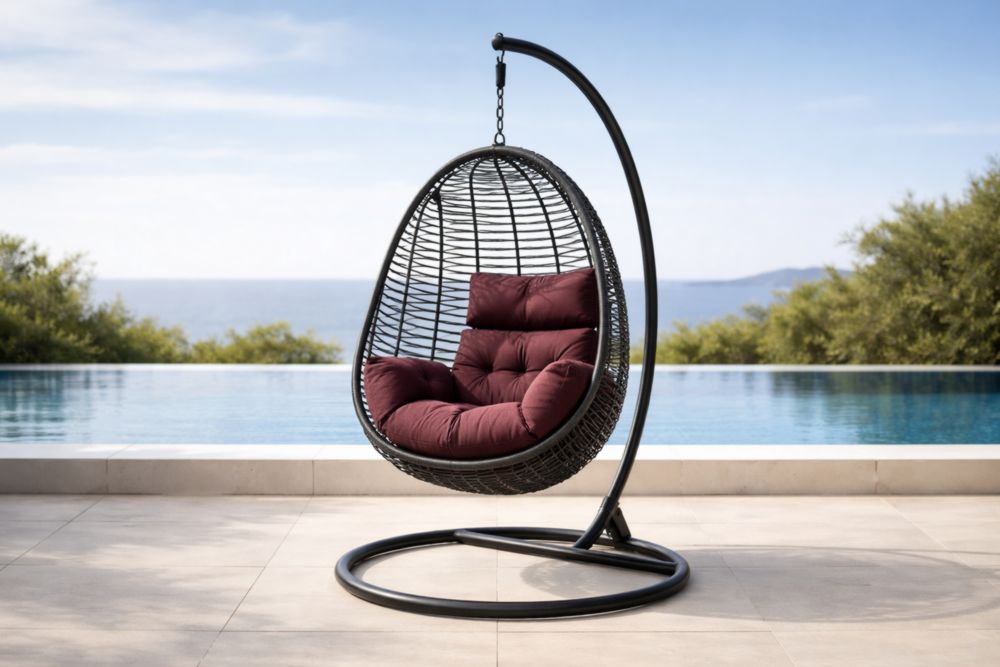 Fauteuil suspendu en rotin noir avec coussin bordeaux