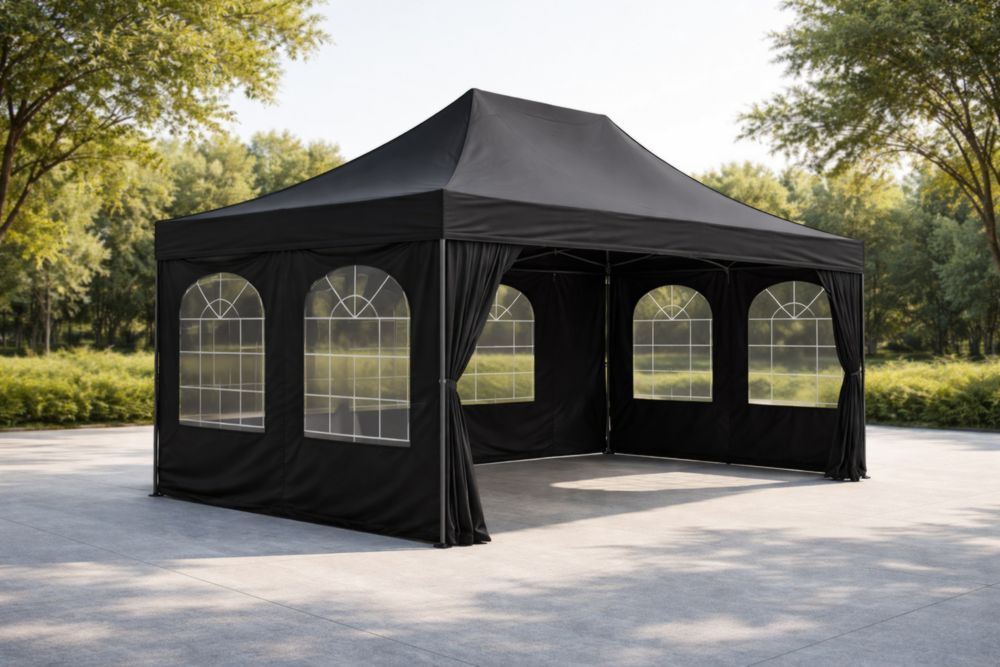 Tonnelle pliante extérieure noire en acier avec fenêtres en PVC 3x3×2.6m